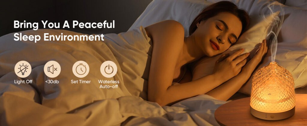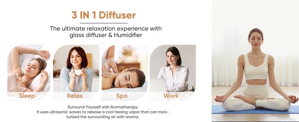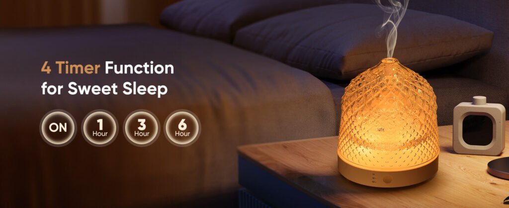 - ♨【Ultra Quiet & 4 Timer Setting】Small glass air diffuser is advanced 2.4MHZ high frequency ultrasonic vibration technology produces a fine mist, which noise can be controlled below 30dB to create a perfect sleeping atmosphere and bring you a relax life. 4 timer settings and you can choose between 1 Hour, 3 Hour, 6 Hour, and always on. You can enjoy a lazy and relaxing time in small & large room – your home, living room, bedroom, bathroom, office, hotel, coffee shop, study, yoga, pilates, children’s music room, gym or spa.
