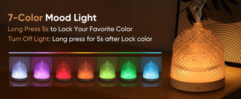 - ♨【Lock the Color by LONG PRESS 5S】Glass essential oil diffuser has 7 cycle soothing colors and you can lock your favorite color according to your mood and customize your mood color by long press 5S. The perfect combination of delicate mist and romantic lights creats a calm and comfortable atmosphere for you. Add 1-3 drops of your favorite essential oil and water to this air aroma glass diffusers and it will run for 6-10 hrs!