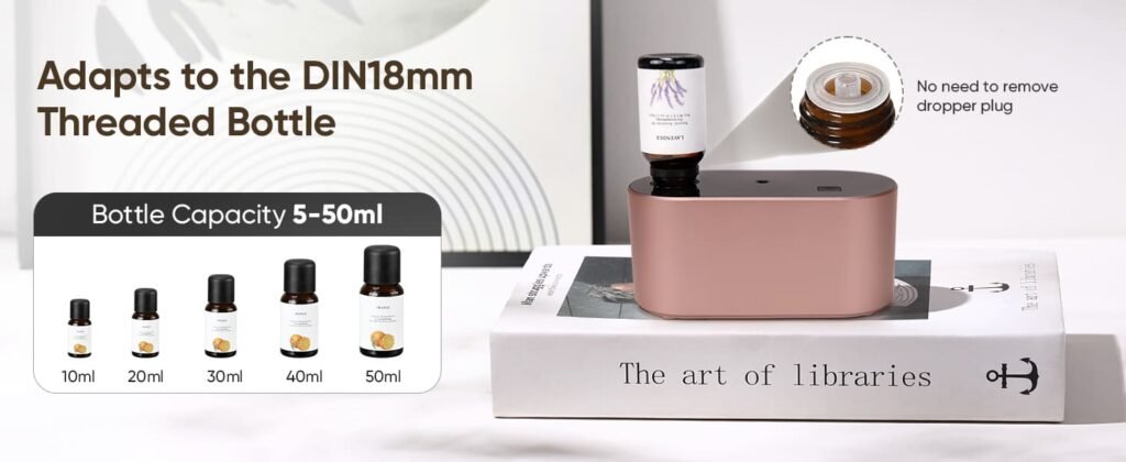 - 【No Need To Remove The Dropper Plug】Our battery operated diffuser features an innovative dropper plug design compatible with DIN18mm threaded bottles, allowing you to effortlessly use it without removing the dropper caps. Compatible with most essential oil bottles from 5ml to 50ml and various pure essential oils on the market, this rechargeable nebulizing diffuser delivers unprecedented freedom and convenience in your aromatherapy experience.