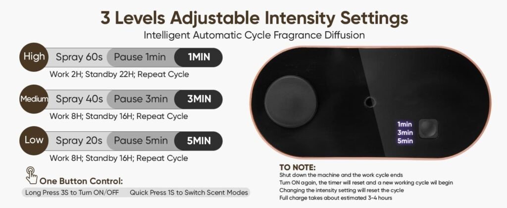 - 【3 Mist Intensity Cycle Mode】Customize your aromatherapy experience with the multifunctional settings of our waterless oil diffuser. It features 3 intermittent mist intensity modes:High(Mist 60S,Pause 1MIN), Medium (Mist 40S,Pause 3MIN), Low(Mist 20S,Pause 5MIN). You can adjust the fragrance strength according to your preferences, different spaces such as home, bedroom, living room, hotel, kitchen, or various scenes such as work, sleep, leisure, exercise, spa, yoga, meditation, etc.