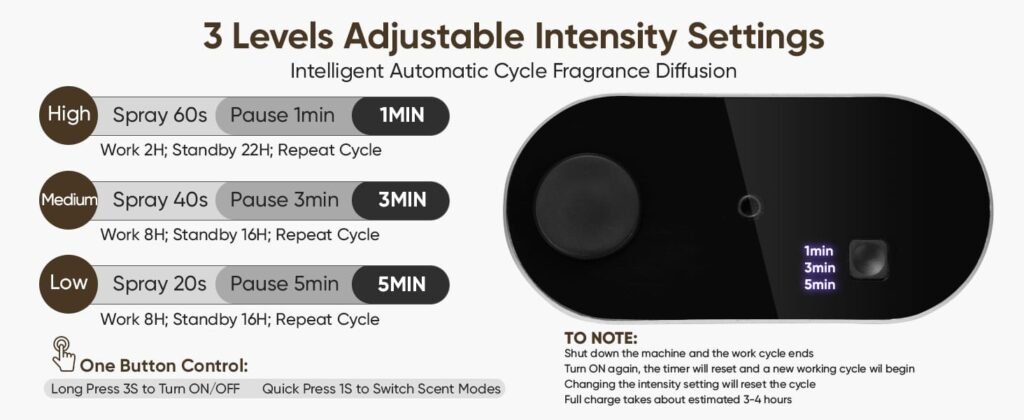 - 【3 Mist Intensity Cycle Mode】Customize your aromatherapy experience with the multifunctional settings of our waterless oil diffuser. It features 3 intermittent mist intensity modes:High(Mist 60S,Pause 1MIN), Medium (Mist 40S,Pause 3MIN), Low(Mist 20S,Pause 5MIN). You can adjust the fragrance strength according to your preferences, different spaces such as home, bedroom, living room, hotel, kitchen, or various scenes such as work, sleep, leisure, exercise, spa, yoga, meditation, etc.