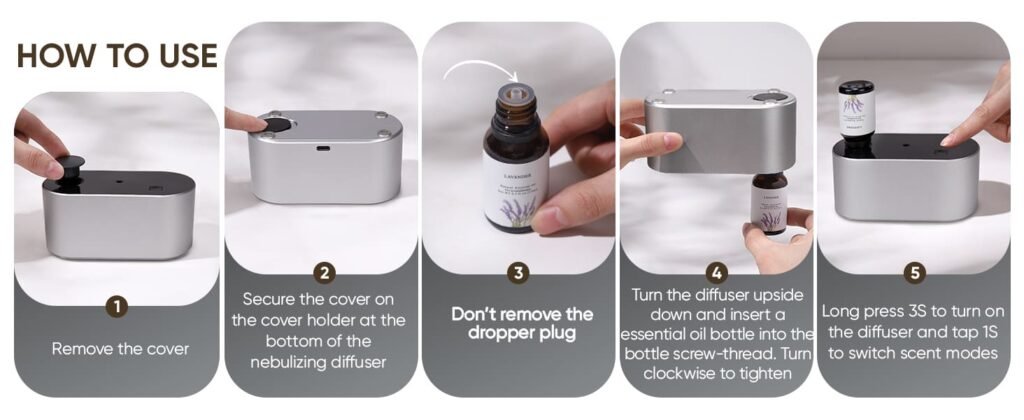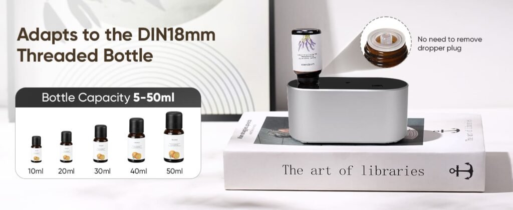 - 【No Need To Remove The Dropper Plug】Our battery operated diffuser features an innovative dropper plug design compatible with DIN18mm threaded bottles, allowing you to effortlessly use it without removing the dropper caps. Compatible with most essential oil bottles from 5ml to 50ml and various pure essential oils on the market, this rechargeable nebulizing diffuser delivers unprecedented freedom and convenience in your aromatherapy experience.