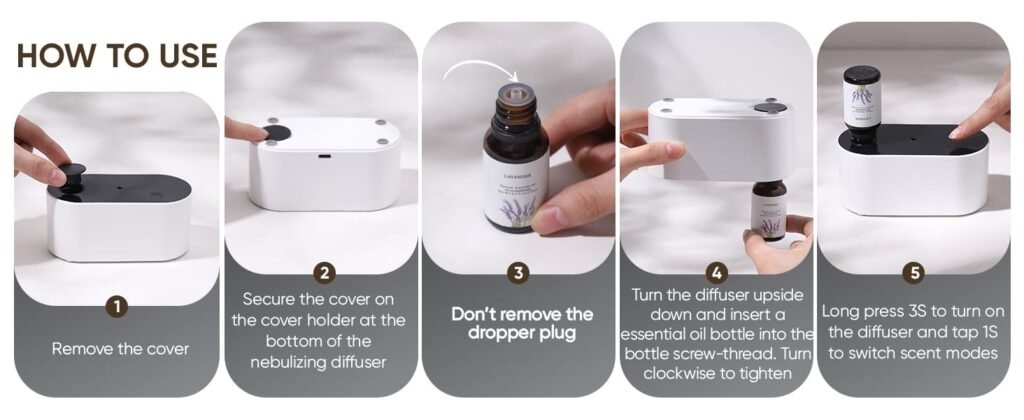 - 【No Need To Remove The Dropper Plug】Our battery operated diffuser features an innovative dropper plug design compatible with DIN18mm threaded bottles, allowing you to effortlessly use it without removing the dropper caps. Compatible with most essential oil bottles from 5ml to 50ml and various pure essential oils on the market, this rechargeable nebulizing diffuser delivers unprecedented freedom and convenience in your aromatherapy experience.