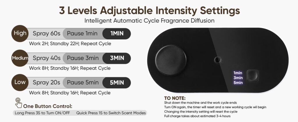 - 【3 Mist Intensity Cycle Mode】Customize your aromatherapy experience with the multifunctional settings of our waterless oil diffuser. It features 3 intermittent mist intensity modes:High(Mist 60S,Pause 1MIN), Medium (Mist 40S,Pause 3MIN), Low(Mist 20S,Pause 5MIN). You can adjust the fragrance strength according to your preferences, different spaces such as home, bedroom, living room, hotel, kitchen, or various scenes such as work, sleep, leisure, exercise, spa, yoga, meditation, etc.